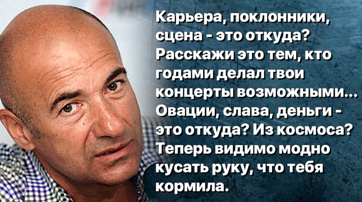 Композитор не скупится на резкие высказывания, ставя под сомнение все достижения певицы и подчёркивая роль творческого коллектива в её успехе. По его словам, все привилегии — от внимания публики до финансового благополучия — стали возможны исключительно благодаря совместным усилиям команды профессионалов.