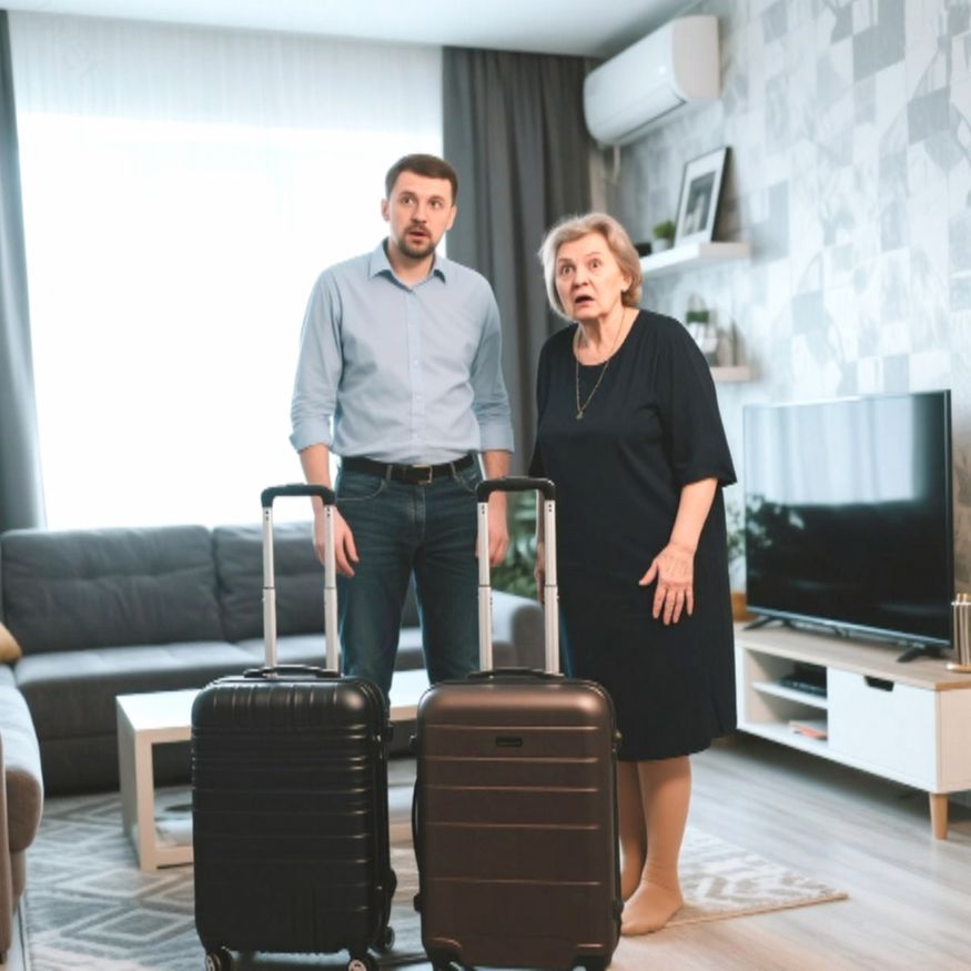 — А это ваши с мамой вещи, вы съезжаете, — радостная супруга поставила перед мужем два больших чемодана.