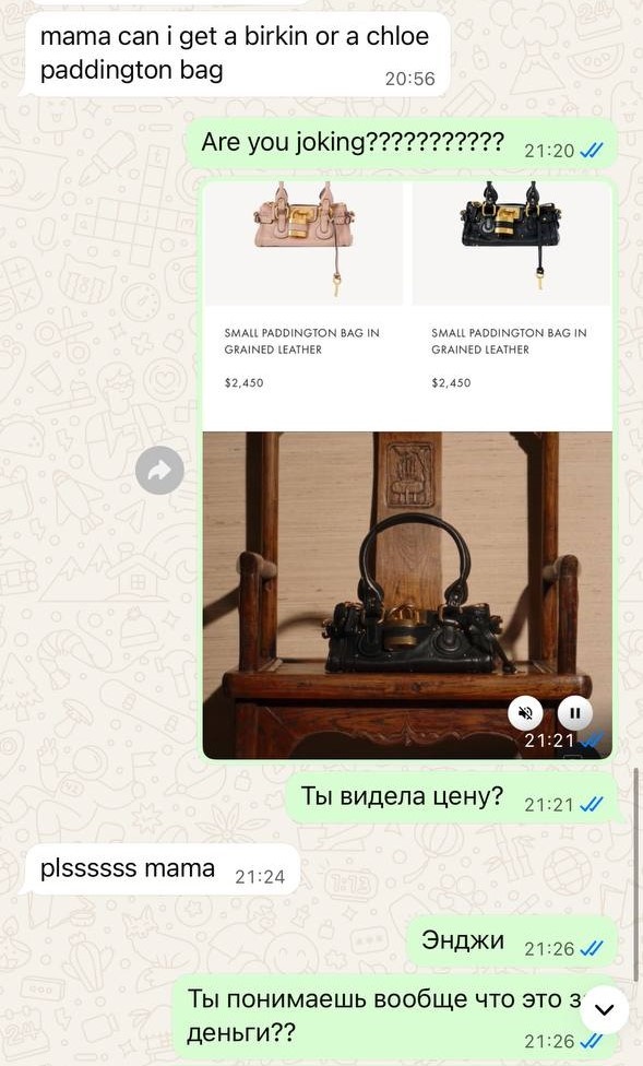Участница шоу «Звезды в Африке» уже отчитывала дочь за бездумные траты денег, а после недавнего инцидента с отелем обещала, что больше не будет оплачивать ее прихоти. «Ну всё. Приехали. Дочка просит сумку Биркин Hermes. Или хотя бы Chloe за 2500», — возмутилась Боня в своем Telegram-канале.