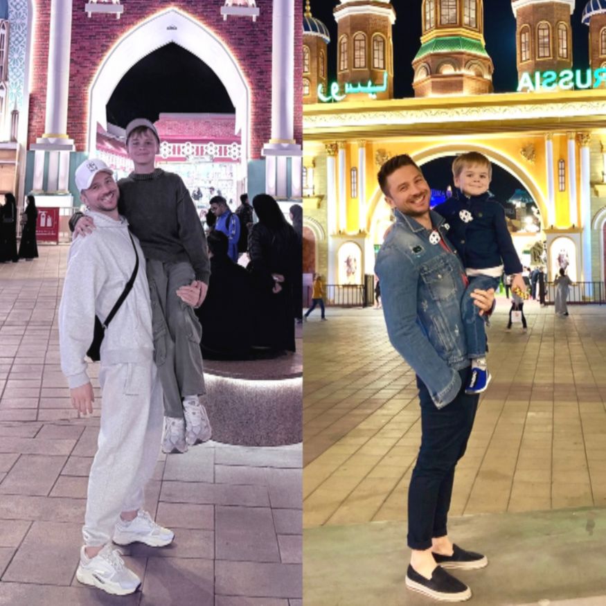 Лазарев сделал фото с сыном, повторив позы, которые были на снимках семилетней давности. «На том же месте. Отдыхаем всей семьей! Приехали в Global Village. Были тут с Никитой в 2019, и вернулись вновь уже все вместе», — прокомментировал Сергей.