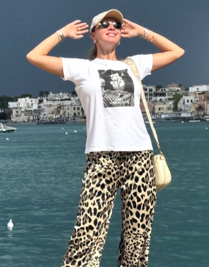Затем многодетная мама показала еще один образ. Она надела белую футболку с принтом, леопардовые свободные брюки и белые кеды. «Итальянские каникулы. Неожиданное приглашение, но очень приятное. Спонтанное решение, но очень правильное. Поддержка друзей — золото», — заверила Полина.