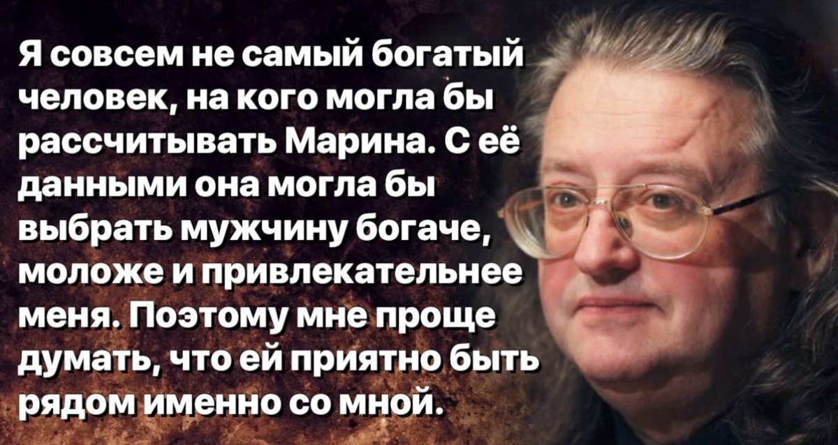Такова общепринятая трактовка обстоятельств их встречи. При этом сам музыкант описывал знакомство весьма живописно: он заметил Марину на улице и, несмотря на непрезентабельный вид (только что вернулся со стройки), решился подойти.