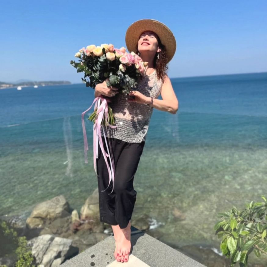 Бывшая супруга Тиграна Кеосаяна сопроводила пост рядом кадров с отпуска. На фото Алена, широко улыбаясь, позировала с букетом роз на фоне моря. Артистка выглядела беззаботно — она примерила черные брюки прямого кроя, сверкающую майку и кокетливую соломенную шляпку. Звезда предстала перед камерой босиком.