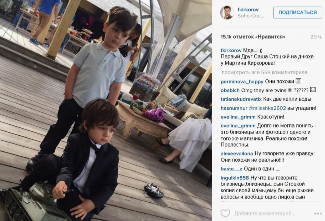 Дети звезд с темными волосами и большими выразительными глазами, несмотря на разницу в возрасте, выглядели словно братья-близнецы. Эта особенность не укрылась от зорких глаз фанатов и журналистов, а в СМИ появились сообщения вроде: «Анастасия Стоцкая родила от Киркорова», «Стоцкая дала Киркорову свою яйцеклетку».