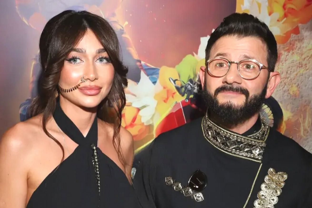 Влюбленные облачились в парные наряды. На Галустяне был черный костюм с золотыми вставками в индийском стиле. Его спутница надела черно-золотое платье в пол в духе Болливуда. Приталенный фасон наряда подчеркнул ее стройную фигуру.